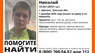 В Тульской области стартовала поисковая операция: отряд «ЛизаАлерт» разыскивает 13-летнего жителя города Щёкино Николая Тяпкина. Связь с мальчиком оборвалась 7 декабря, и на данный момент о его местонахождении ничего не известно.